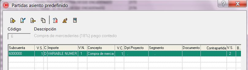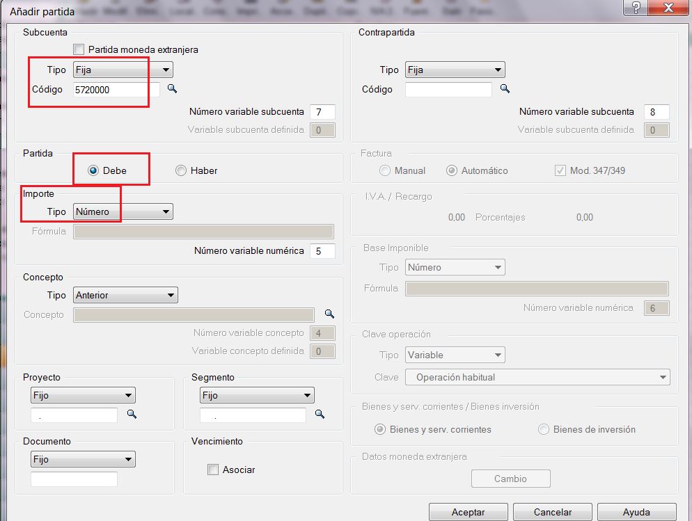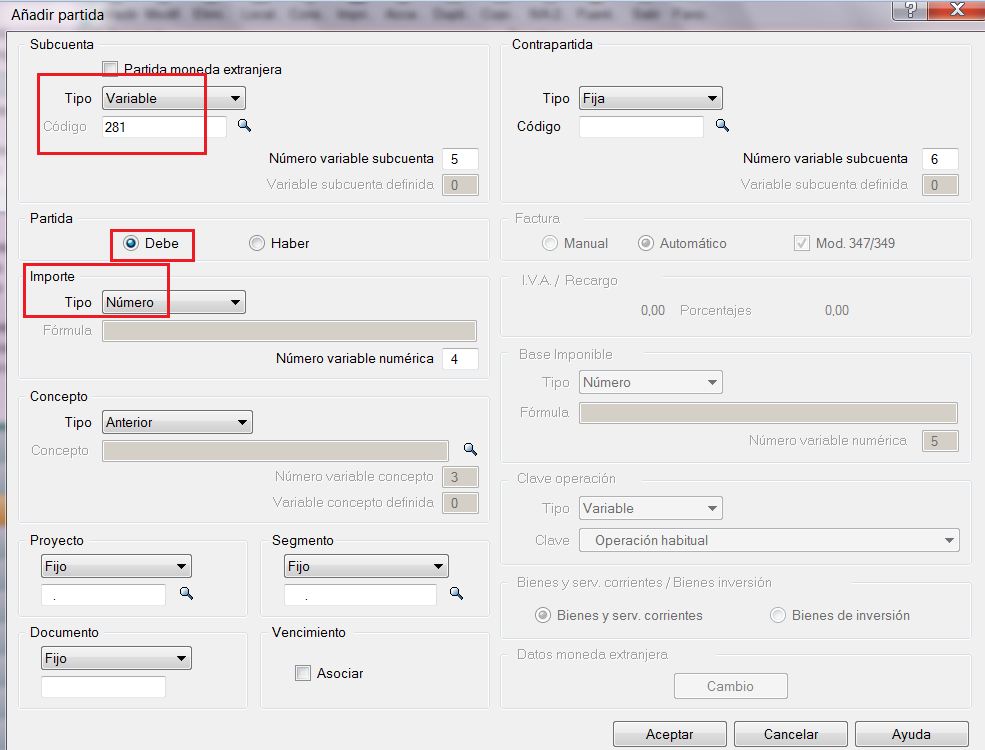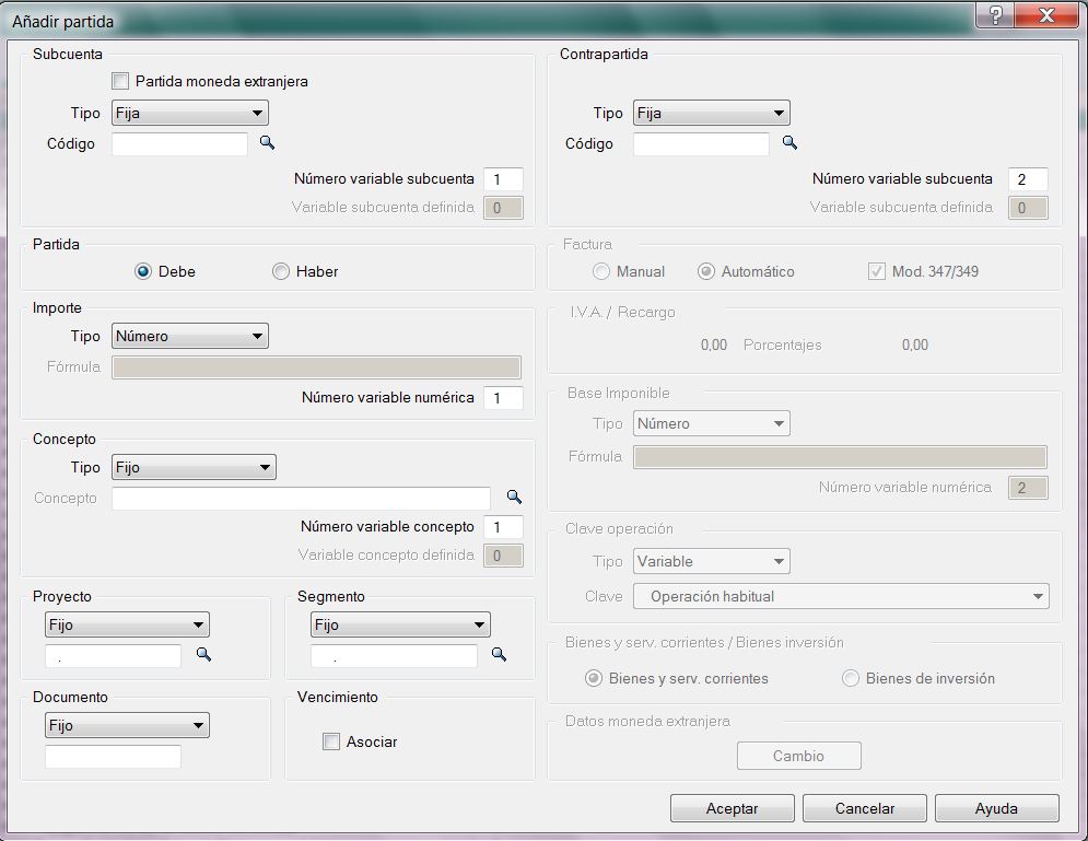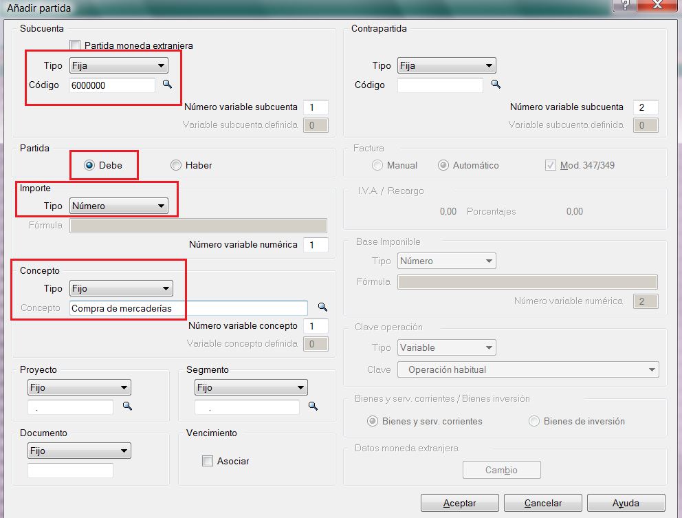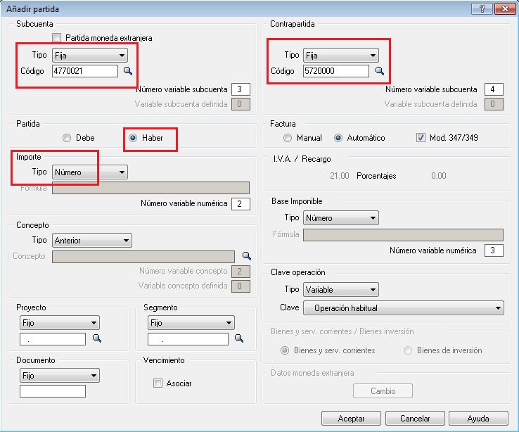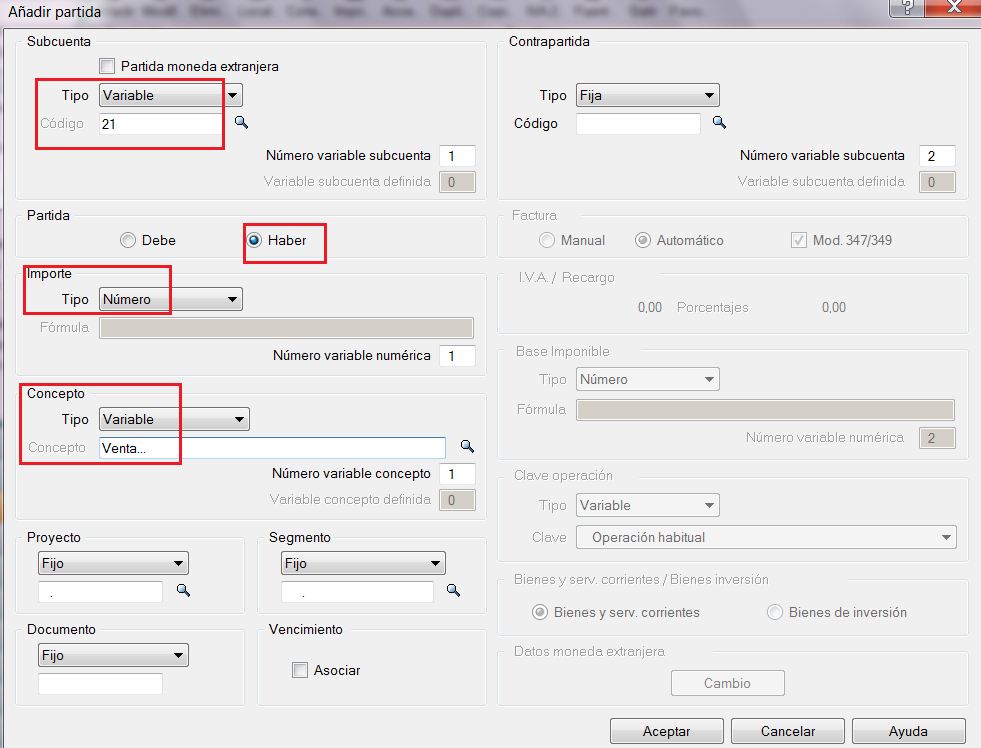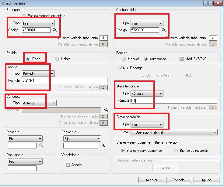 Nota importante: el importe lo hemos puesto automático (como fórmula), se trata del 21% del importe de la compra (variable númerica N1, tal como puede apreciarse en la figura anterior). La contrapartida la hemos puesto a Banco c/c porque es operación al contado. Los campos de la base imponible y clave de la operación es necesario indicarlos para que el asiento se haga automáticamente con indicar el importe del gasto por la compra.