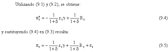 La forma de los modelos utilizados en la literatura para contrastar el Efecto Fisher depende de las hipótesis que se hagan respecto los elementos que aparecen en las relaciones escritas en (9.1)-(9.3). Nosotros, en este capítulo, sin ánimo de ser exhaustivos, vamos a prestar atención solamente a algunos de esos modelos.