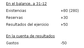 El movimiento en las cuentas de existencias en el ejercicio X0, de acuerdo con los dos criterios habría sido:Por lo tanto, el efecto del cambio en las existencias iniciales del ejercicio X1 es de 80 u.m. El ajuste al inicio del ejercicio X1, con cuentas de reservas sería: