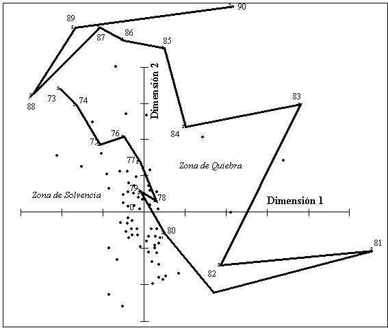 Se observa que entre 1973 y 1976 el banco se encontraba en la zona de solvencia. Concretamente presenta un valor alto para la segunda dimensión, que habíamos identificado como la liquidez, resultado coherente con lo que conocíamos por los diagramas de caja. En 1977 se desplaza a la zona de quiebra. En 1978 su situación empeora mucho, experimentando una ligera mejoría en 1979, tal y como se interpretaba de la observación de los diagramas de caja de varios ratios.