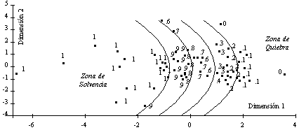 Una posibilidad interesante es superponer los resultados del análisis discriminante (o, mejor, el análisis logit pues el resultado se puede interpretar como probabilidad de quiebra) sobre el mapa producido por las Escalas Multidimensionales.