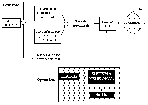 En realidad todo el procedimiento que vemos en la figura es estadístico: primero se selecciona un conjunto de datos, o patrones de aprendizaje en jerga neuronal. Después se desarrolla la arquitectura neuronal, número de neuronas, tipo de red. Por decirlo con otras palabras, se selecciona el modelo y el número de variables dependiente e independientes. Se procede a la fase de aprendizaje o estimación del modelo y a continuación se validan los resultados.