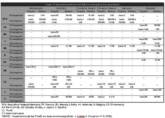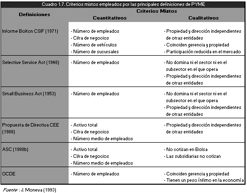 En el cuadro 1.6. se recoge una lista de las principales definiciones de PYME que se basan en criterios cuantitativos. Como se puede apreciar en dicho cuadro y tal como lo indica C. Menéndez (1982 p. 24) "...el tamaño de la plantilla y la cifra de negocios son los dos criterios generalmente más admitidos para establecer una delimitación de la dimensión...", además de prevalecer por sus características de claridad, adaptabilidad y fácil aplicación(9).