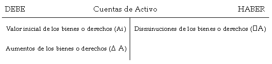 El convenio de cargo y abono establecido para las cuentas de Activo es el siguiente, de lo que se deduce que siempre tendrán saldo deudor: