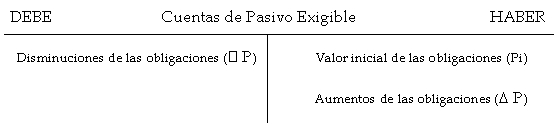 El convenio de cargo y abono establecido para las cuentas de Pasivo Exigible es el siguiente, de lo que se deduce que siempre tendrán saldo acreedor: