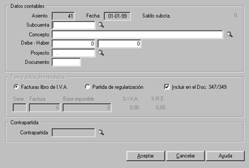 Para introducir asientos se pulsa eny se incorporan los datos de subcuenta, concepto, cantidades, proyecto, documento, contrapartida, etc.