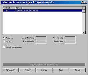 Permite copiar asientos desde cualquier empresa mediante el número de asiento (seleccionar rango) o por fechas (seleccionar fecha inicial y final).