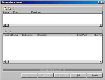 Para buscar apuntes concretos por número de asiento, fecha, subcuenta, concepto, debe, haber y escogiendo las condiciones de búsqueda (igual, mayor, menor que).