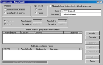 Los ficheros de diario y subcuenta del programa. Permite exportarlos a otros programas incluidos de tratamiento de texto y hojas de cálculo. La importación debe cumplir una serie de requisitos más exigentes.