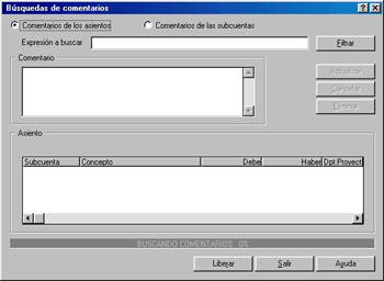 Permite la búsqueda de comentarios en asientos y subcuentas por medio de expresiones que puedan aparecer en el comentario.
