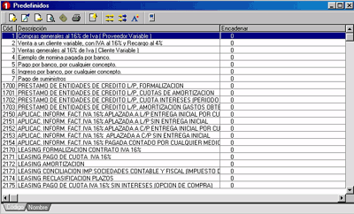 Permite crear, modificar y eliminar asientos predefinidos. Por tanto es en esta ventana donde vamos a añadir los asientos que nos interese tener predefinidos por la frecuencia en su utilización para que la contabilización de los mismos sea más ágil.
