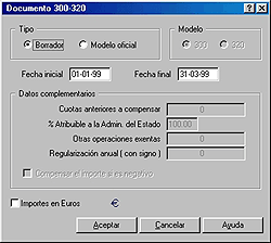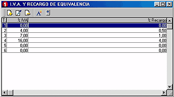 Posibilita el empleo de distintos porcentajes y la modificación de los mismos. Mediante esta opción podemos configurar los actuales valores del IVA en unas tablas, así como los porcentajes del recargo de equivalencia que pueden corresponder a cada uno.