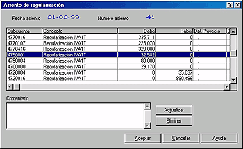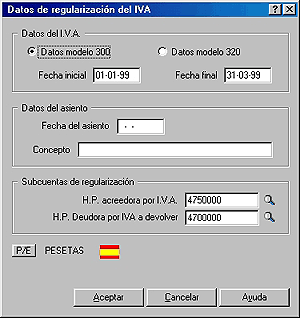 Para realizar automáticamente el asiento de regularización del IVA. Al aceptar, nos muestra el asiento y -si estamos de acuerdo- volvemos a aceptar para su paso al Libro Diario. (El programa actualiza automáticamente la fecha de ultima regularización del IVA).