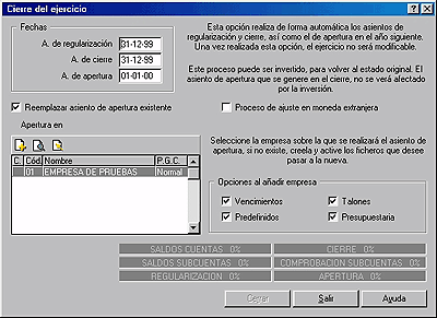 Realiza automáticamente el cierre contable, efectuando los asientos de ajuste en moneda extranjera, regularización, cierre de ejercicio y asiento de apertura en una nueva empresa.