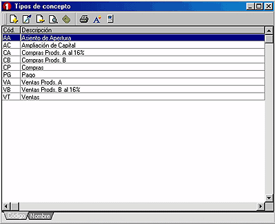 Es una tabla para agilizar la introducción de asientos, al poder incorporar el contenido del campo "Concepto" de una forma más automática sin tener que teclear ese concepto completamente. Se define el código de cada concepto que será lo que tecleemos al introducir el asiento.