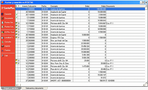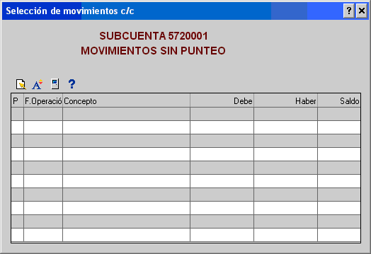 Desde punteo/casación, pulsando en esta opción se abre un listado de movimientos ordenado por subcuentas, con los mismos campos que la pantalla de punteo.