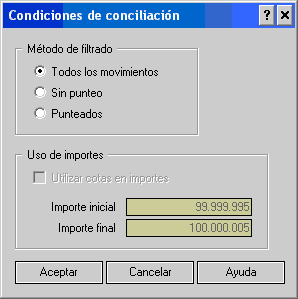 Pulsando el botón de punteo conciliación sobre una partida, especificaremos el método de filtrado de movimientos, pudiendo acotar por importes.Tras aceptar aparece una pantalla con los movimientos bancarios asociados a la subcuenta. En ella se puede puntear el deseado realizando doble click o seleccionándolo con el botón correspondiente.