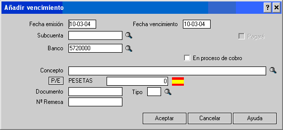 La ventana que se abre incluye los siguientes campos a rellenar: Fecha de emisión y vencimiento, Subcuenta a la que imputamos el mismo, Banco con el que se producirá el pago o cobro, concepto, importe, tipo, documento y nº de remesa. En algunos de estos campos existe la opción de realizar la búsqueda incremental mediante la lupa o pulsando la tecla "+". Al aceptar el vencimiento se añadirá a la lista de los ya existentes.