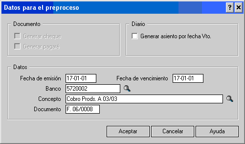 La ventana que se abre al pulsar esta opción incluye los siguientes campos:generar cheque y pagaré: para generar automáticamente el cheque o el pagaré y poderlo imprimir y pagar al acreedor. Generar asiento por fecha de vencimiento: para que el programa genere automáticamente el asiento en el diario. Fecha de emisión y vencimiento: esta última será la del asiento Banco: por el que se efectuará el pago Concepto: que aparecerá en el asiento Documento: del asiento