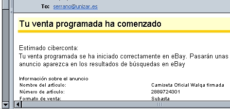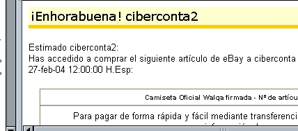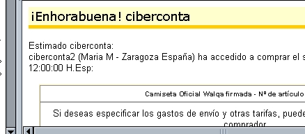 1) El vendedor "ciberconta" desea vender la siguiente camiseta: 2) Rellena los datos sobre el producto y el precio de salida. Ciberconta recibe emails de ebay cuando empieza la puja: 3) Ciberconta2 es el nombre del comprador y también recibe emails de ebay: 4) Ciberconta2 gana la puja: 5) Ciberconta es informado del resultado de la venta: 6) Ciberconta recibe una factura de ebay, por la comisión (en este caso era 1 euro):