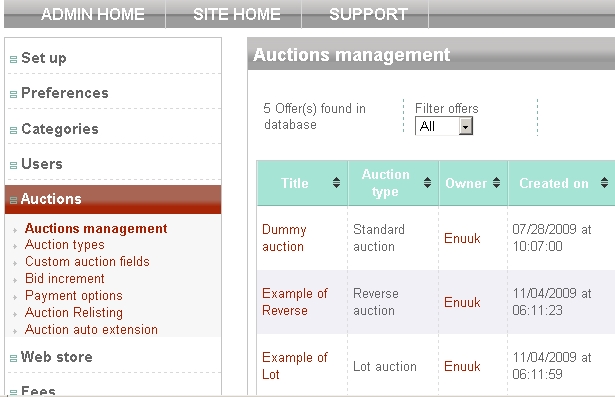 Los tipos básicos de subastas son las subastas para un artículo único o lotes no separables, esta es llamada "Inglesa". El otro tipo es para vender muchos artículos idénticos o lotes separables, esta es llamada subasta "Holandesa". Modalidades de subastas