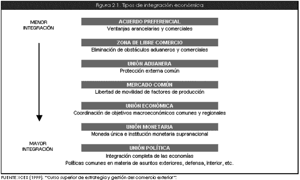 Producto de diversos acuerdos políticos los países en la actualidad presentan una mayor relación comercial. Existen diversos grados de relación en materia económica entre los distintos Estados, algunos poseen simples acuerdos bilaterales; otros en cambio conforman toda un área o región económica. En este aspecto la figura 2.1. nos muestra el grado de integración que pueden presentar los países según sea el tipo de acuerdo que desarrollen.