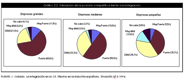Otro aspecto de interés que considera el estudio, es un análisis de la valoración de la posición competitiva de la empresa española frente a la integración (ver gráfico 2.2.). en este aspecto, el 11,5% de las grandes entidades consideran que poseen una posición competitiva muy fuerte y un 60,6% estima que su posición es fuerte; en el caso de la mediana empresa, estas cifras son 10% para una posición muy fuerte y 50% para una fuerte; ahora si observamos los valores correspondientes a la pequeña empresa, veremos que descienden a un 5,5% para una posición muy fuerte y 35,7% para una fuerte competitividad. Claramente se aprecia como a medida que disminuye el tamaño de la entidad, menor es su competitividad frente a la integración. No es extraña esta situación si consideramos las debilidades estructurales (comentadas en el capítulo I) que afectan a la PYME. Además frente al proceso de globalización las medianas y pequeñas unidades económicas presentan numerosas desventajas en comparación con la gran empresa.