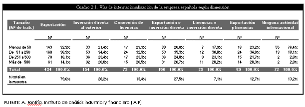 Para hacernos una idea de las estrategias utilizadas por las empresas españolas para su internacionalización nos basaremos en el trabajo realizado por A. Fonfría(11). Este estudio considera un universo de 545 empresas de las cuales el 77% pertenecen al sector industrial. Como se aprecia en el cuadro 2.1. se consideran como vías de internacionalización: exportaciones; inversión directa en el exterior; concesión de licencias y combinaciones entre estas tres alternativas.
