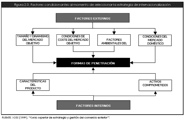 Para desarrollar este punto nos basaremos en las recomendaciones dadas por el ICEX(10) para seleccionar la forma de penetración en el extranjero. En este aspecto, tal como lo muestra la figura 2.3. se identifican dos tipos de factores a tener en consideración, a saber: