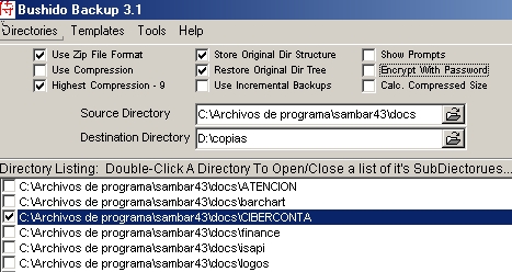 Una vez instalado simplemente se le dice la carpeta donde están los ficheros (la unidad C:\) y dónde queremos hacer la copia de seguridad (la unidad D:\copias). Se selecciona la carpeta ciberconta y las diversas opciones del programa, por ejemplo queremos que lo comprima en formato .zip, mantenga la estructura del directorio y no queremos que ponga un password. En cuestión de 5 minutos efectua la copia de seguridad y obtenemos un fichero de tamaño considerable ciberconta.zip alojado en el disco duro D. El programa